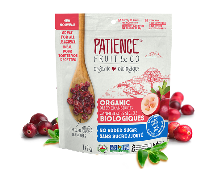 Unique sur le marché, la canneberge séchée biologique sans sucre ajouté et tranchée PATIENCE est une véritable innovation. Légèrement acidulée, elle ne renferme que 2 g de sucre par portion de 40 g provenant naturellement du fruit et conserve sa texture moelleuse tant appréciée.