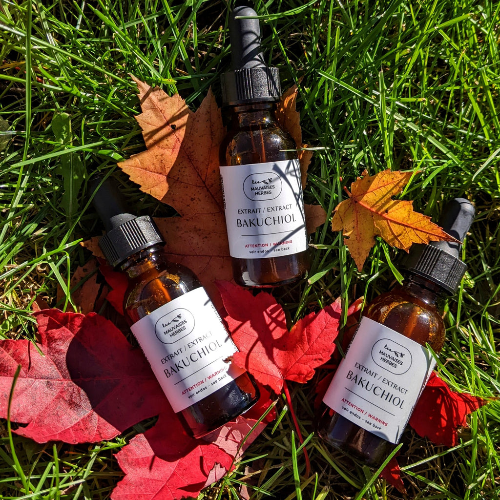 Le bakuchiol est un extrait végétal utilisé dans les cosmétiques DIY. Ne pas l'appliquer pur sur la peau. Voir « Utilisation & Dosage ».