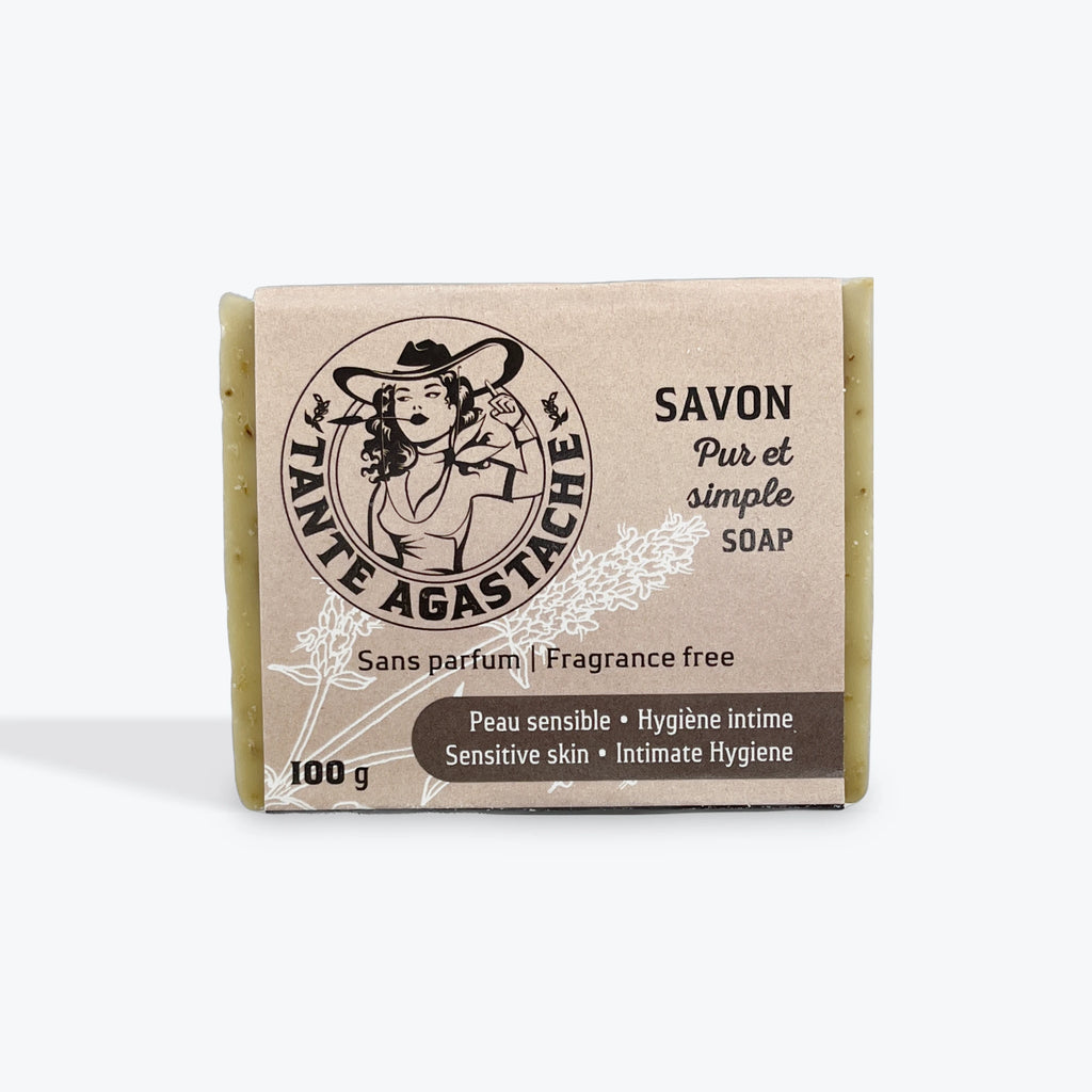 Suif de bœuf saponifié, eau florale d’agastache*, décoction de guimauve*, glycérine (apparaît naturellement lors de la réaction de saponification), argile blanche, fleurs de mélilot*, sirop d’érable*, vitamine E.